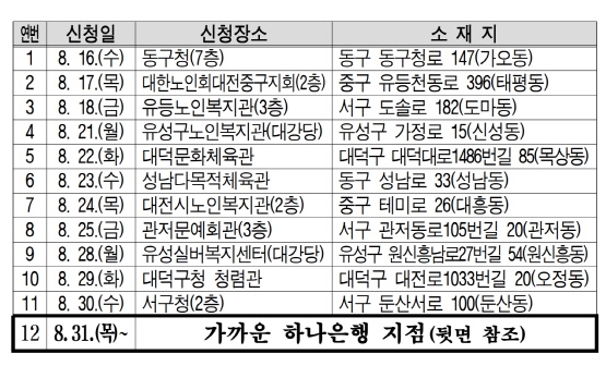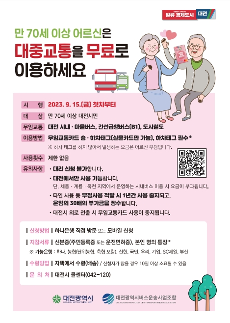 대전 민선 8기 공약사업 중 하나인 「만 70세 이상 버스비 무료화」 시행을 2023년 9월 15일(금) 첫차부터 무료로 이용하실 수 있습니다. 어르신 어르신 무임교통카드는 8월 16일부터 모바일 상시 접수가 가능하며, 현장 접수는 16-30일 각 구별 순회 장소에서 하면 됩니다. 주소와 상관없이 원하는 곳에서 신청 가능하며, 접수시간은 오전 9시부터 오후 4시까지입니다. 31일부터는 하나은행 각 지점에서 접수를 받고 있습니다.