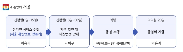 신청방법은 매월 1일부터 15일까지 부모 등 양육자가 ‘몽땅정보 만능키’를 통해 온라인으로 신청 가능합니다. 신청이 완료되면 각 자치구에서 자격확인을 거쳐 지원대상을 선정‧안내하며, 익월에 돌봄활동이 시작됩니다. 예를 들어 9월(1~15일)에 서울형 아이돌봄비를 신청한 경우, 9월 중 ‘대상자 선정·알림’, 10월에 ‘돌봄활동 수행’, 11월에 ‘돌봄비 지급’ 순으로 진행됩니다. 자세한 지원조건 및 절차는 9월 오픈 예정인 ‘출산에서 육아까지 몽땅정보 만능키’ 누리집을 통해 확인하실 수 있습니다.