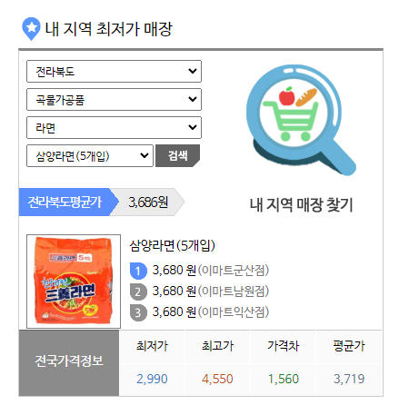 화면의 중간쯤 '내 지역 최저가 매장'을 검색합니다. 이때 지역을 설정 후 본인이 검색하고자 하는 품 옥을 선택하여 검색을 하시면 됩니다. 저는 라면을 좋아하기에, 라면을 검색했더니 3군데 매장이 검색되는 것을 확인할 수 있었습니다.