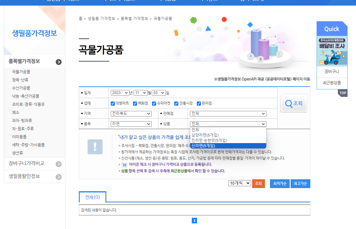 더 자세히 알아보시려면 맨 위쪽 탭의 생필품가격정보에서 '품목별가격정보를' 선택하시면 됩니다.