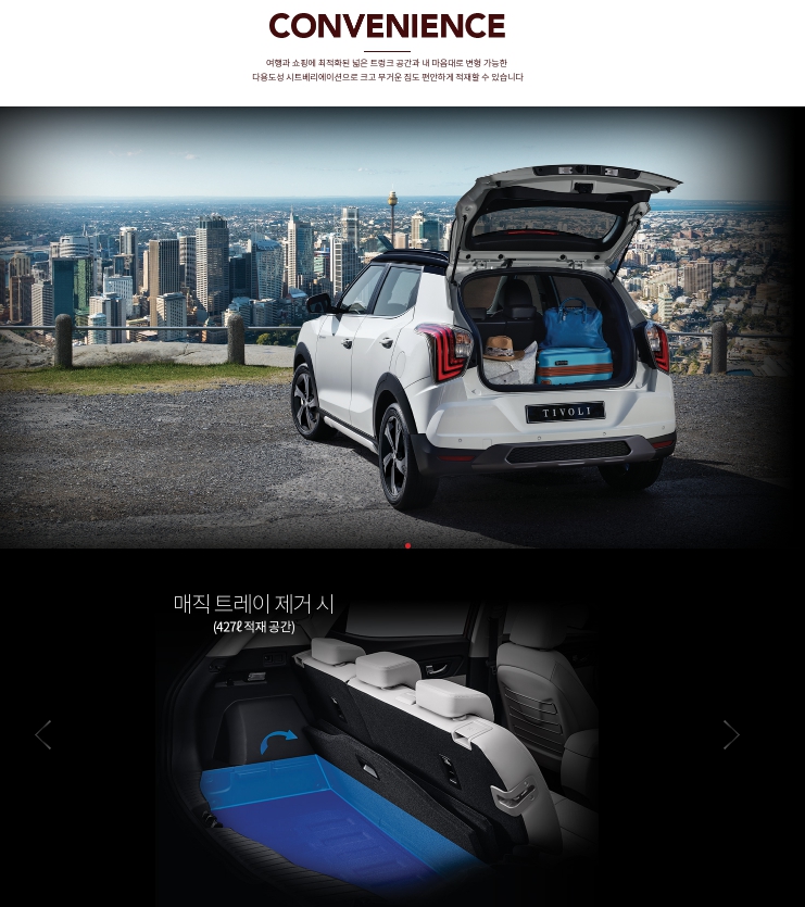 정부공인 표준연비 및 등급표 입니다. 1.5가솔린 4WD는 공인연비가 10.8km 이며, 1.6 가솔린은 공인연비 11.6km 입니다. 두 엔진 모두 아이신의 6단 자동변속기를 사용합니다. 티볼리에어는 1.5 가솔린 터보만 선택 가능하며 연비는 11.9km 입니다. 전장은 4480mm로 티볼리보다 길며 2열을 접으면 1440리터의 넓은 러기지 공간이 생깁니다. 또한 1879mm의 길이가 확보되면서 ‘차박' 도 가능합니다. 커넥티드카 시스템인 인포콘이 탑재됐고 올인원 서비스의 무료 사용 기간은 2년에서 5년으로 확대되었습니다.