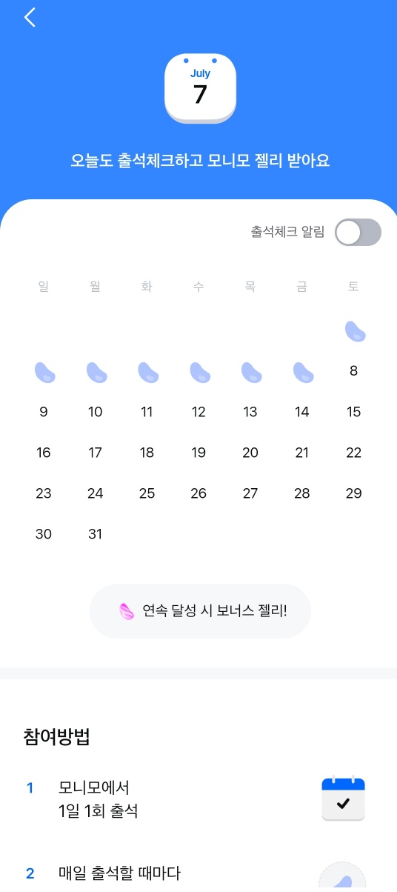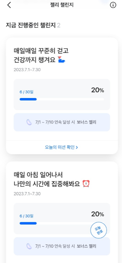 모니모에서는 매달 챌린지를 신청합니다. 7월 챌린지는 아침기상 챌린지와 걷기 챌린지 입니다. 걷기는 하루에 5 천보 이상 걸어야 하며, 아침기상은 오전 7시 30분까지 기상하여서 인증해 주셔야 합니다. 매 달 진행하는 출석챌린지도 있으니 출석체크도 꼭! 하셔야 합니다. 현재 진행하는 미션을 신청해지 못했다 하더라도, 둘째 주에 새로운 미션이 진행됩니다. 미션은 놓치지 말고 신청하셔서 젤리 혜택을 받으시길 바랍니다. 또한 챌린지 미션에 대해 한 달간 빠짐없이 완료할 경우 스페셜젤리를 줍니다.