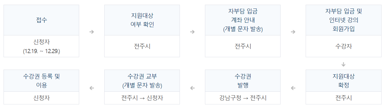 지원방법은 대상자 선정 후 신청 시 입력한 수강자의 휴대폰 번호로 수강권 코드 문자 발송 수강권은 발송 후 3개월까지 등록 가능하며 등록한 날로부터 1년간 수강이 가능합니다. 지원절차는 아래와 같습니다.
