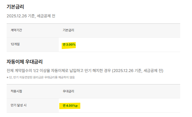 자동이체 조건을 충족하지 못하면 기본금리만 적용되므로, 가입 시 자동이체 설정이 중요하다.