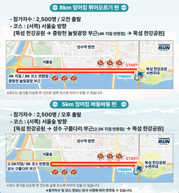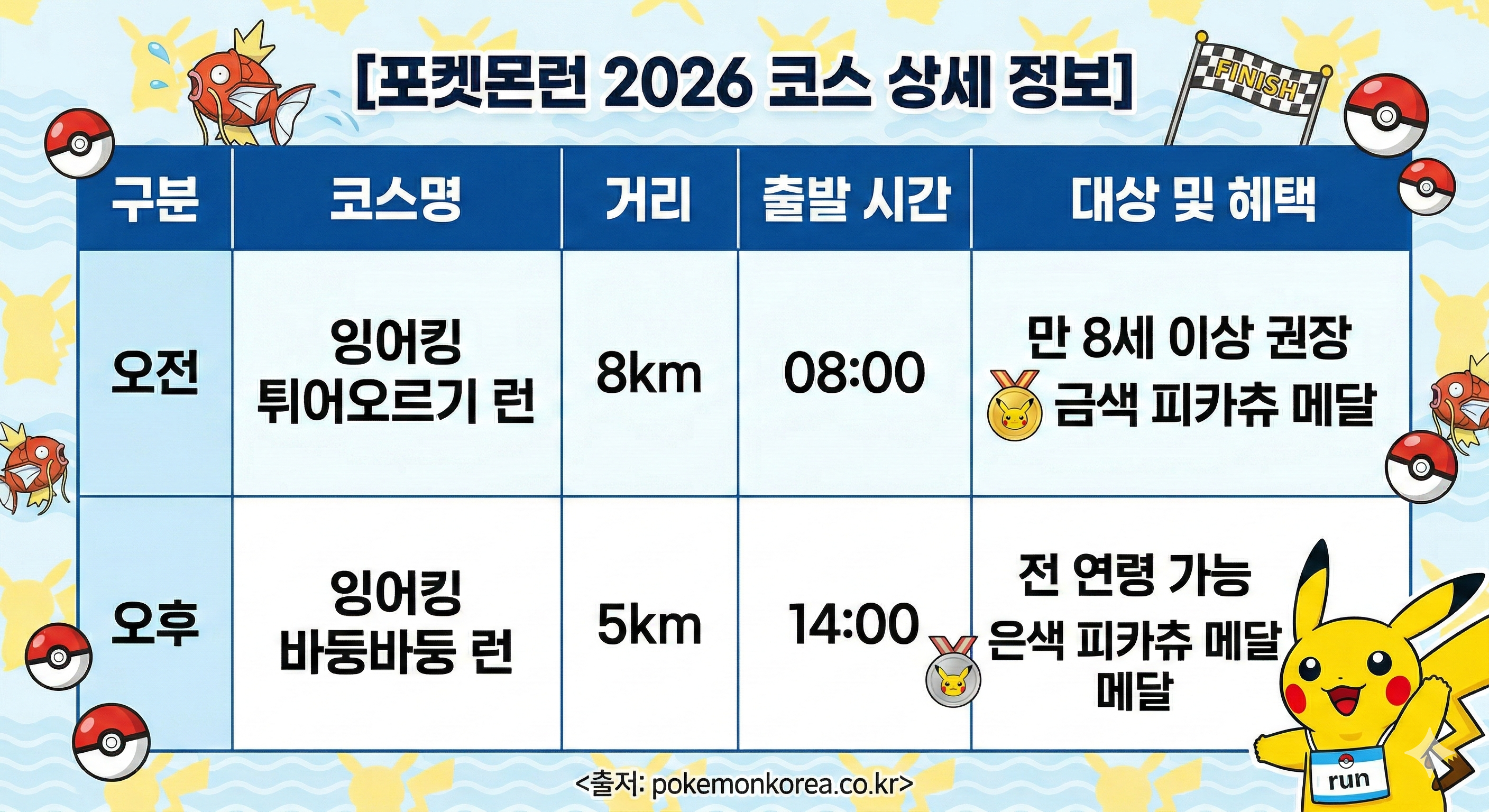 - 완주 기념품: 행사 당일 현장 완주자에게만 '잉어킹 코스튬 피카츄 인형 메달'*이 증정됩니다. (현장 수령 필수)