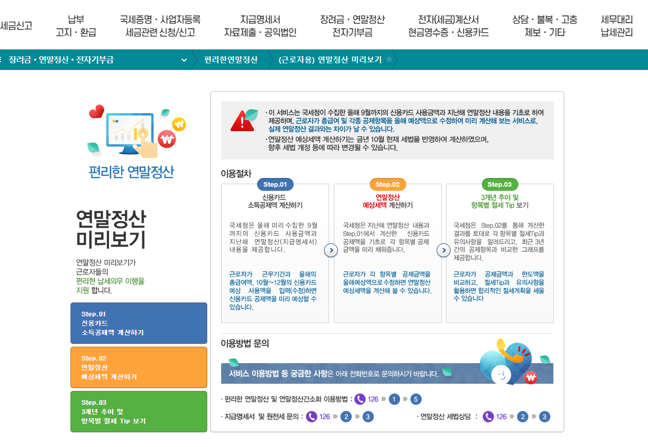 연말정산 미리 보기는 올해 신용카드 사용 금액과 과거 공제 금액을 기초로 내년 연말정산 세액을 계산해 절세 전략을 세울 수 있도록 돕는 서비스 입니다. 홈택스에 접속한 뒤 ‘장려금·연말정산·전자기부금→편리한 연말정산→연말정산 미리보기’ 메뉴를 선택하면 됩니다.