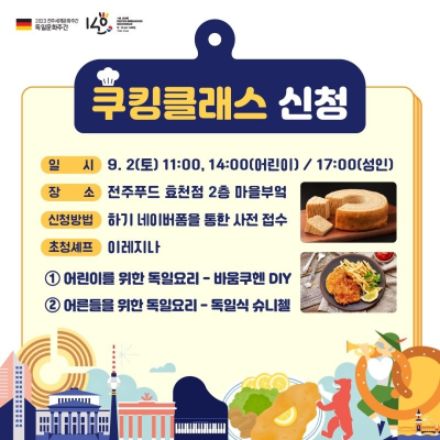 4, 바움쿠헨: DIY쿠킹클래스는 9월 2일(토) 전주푸드 효천점에서 진행하며, 8월 23일(수)부터 신청을 받습니다. 네이버폼을 통한 사전접수입니다. 시식은 9월 2일(토) 세병공원에서 가능합니다.