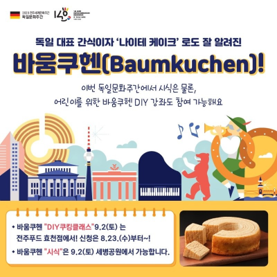 이번 행사는 풍성한 독일 음악을 즐길 수 있는 다양한 음악공연과 바움쿠헨과 슈니첼을 직접 만들어볼 수 있는 쿠킹클래스, 영화로 독일문화를 만나는 독일 영화페스티벌 등이 펼쳐집니다.