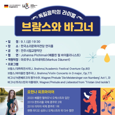 1. 브람스와 바그너: 9월 1일(금) 19:30분, 한국소리문화의전당 연지홀에서 전주시립교향악단의 연주입니다.