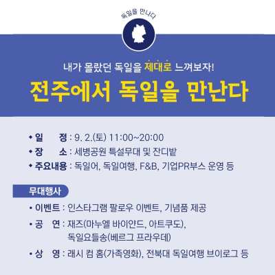 8. 전주에서 독일을 만난다: 9월 2일(토) 11:00~20:00 세병공원 특설무대 및 잔디밭에서 진행됩니다.