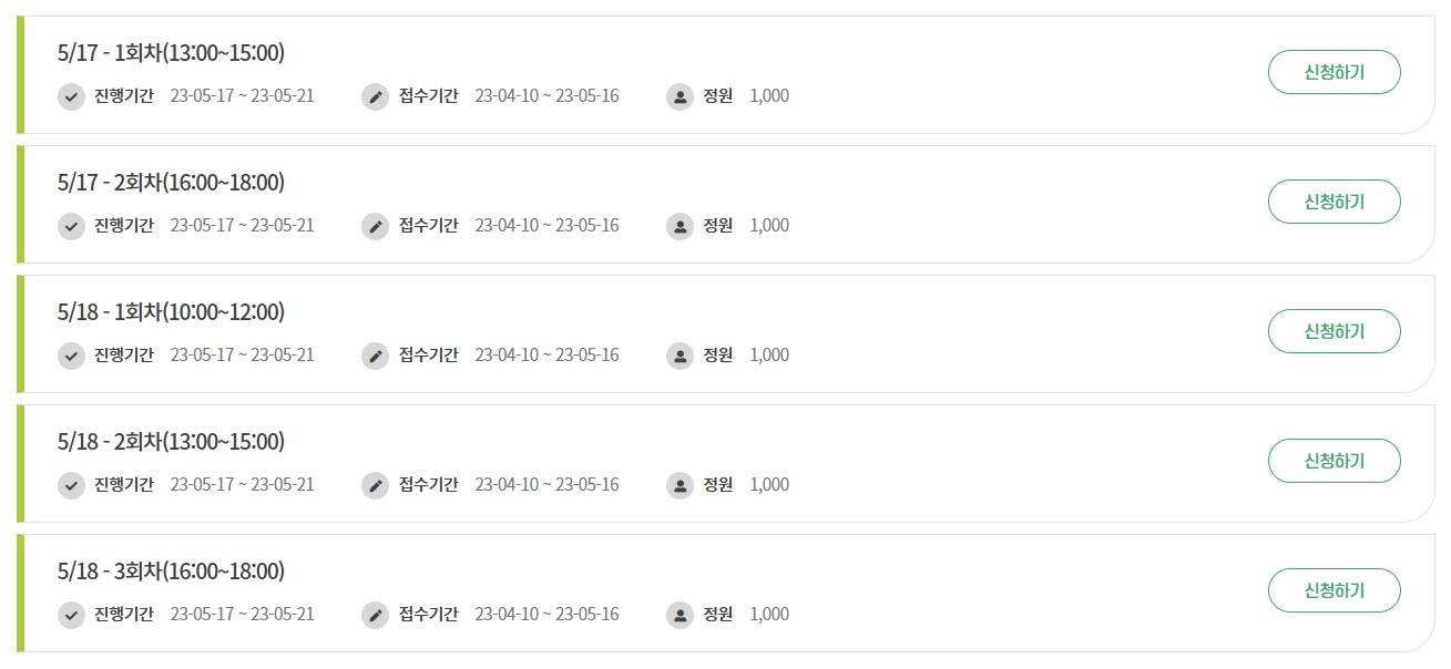 위 신청은 가족정원 만들기 선착순 모집 종료 후 차후 취소 건에 대하여 대기예약자 분들에게 체험을 제공하기 위해 모집합니다. 신청 시 위의 사이트를 클릭하셔서 대기예약자 신청 폼을 클릭하시면 됩니다. 정원에 관심 있는 가족 (1팀 2명 이상) 들은 참가 가능하며 팀당 40만 원 상당 정원조성 식물, 재료를 선택 지원합니다. 해당 참여일에 박람회 산업전 참여부스에서 정원조성 식물, 재료를 선택하시면 됩니다. 신청 날짜와 시간은 아래 이미지를 참고하시기 바랍니다.