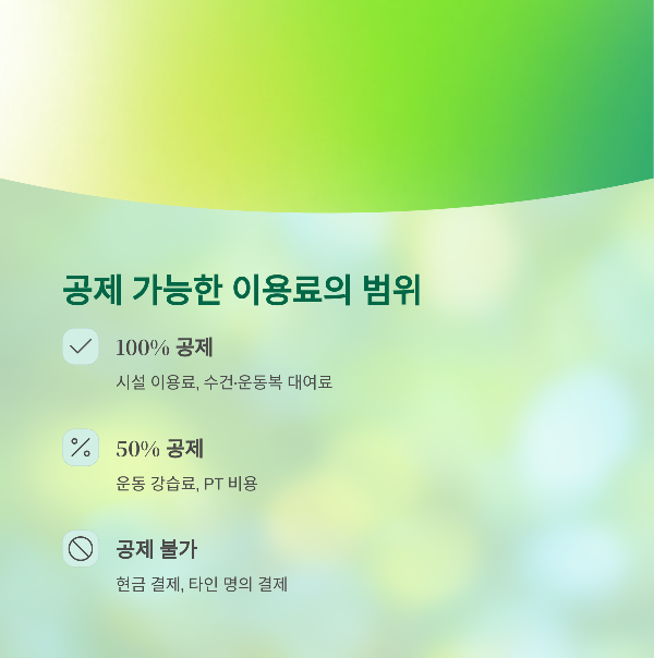 • 수영장, 헬스장 등 시설 이용료와 수건, 운동복 등 대여료는 100% 공제됩니다.